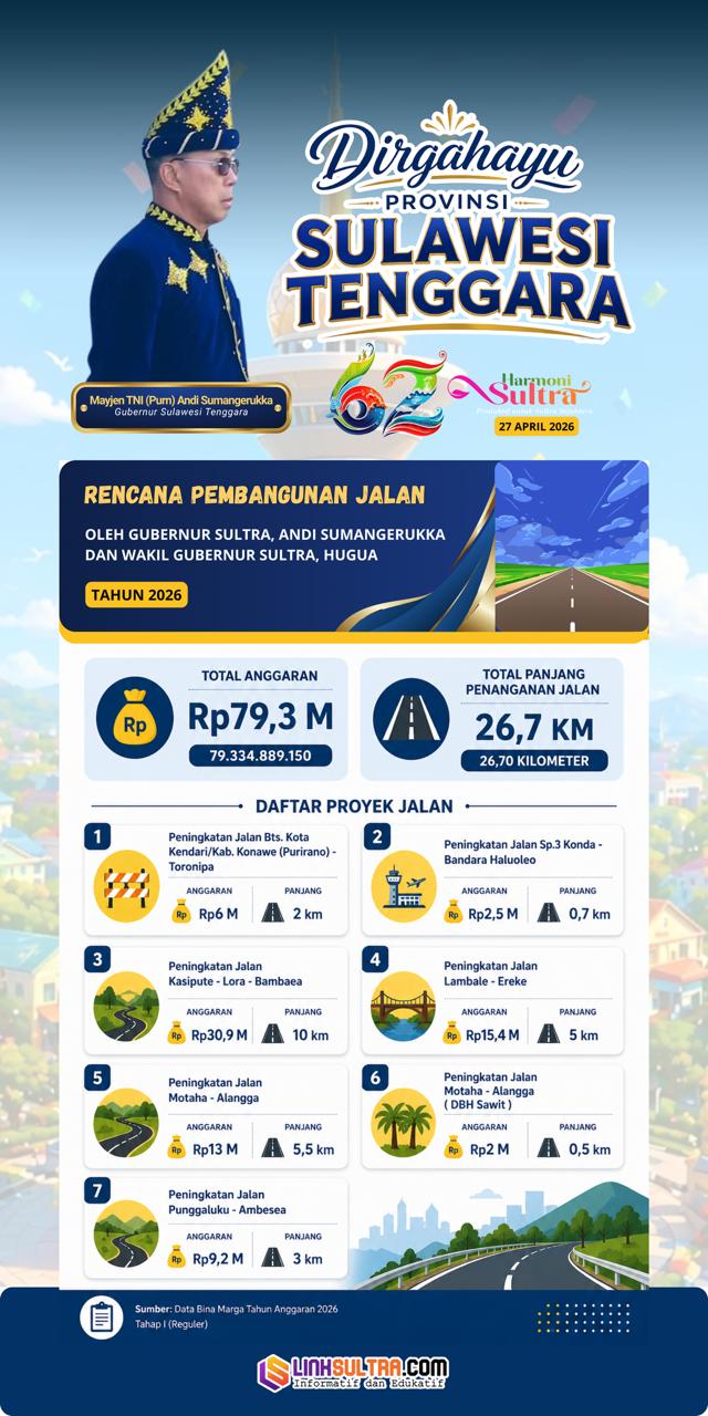 Kepala Dinas Komunikasi dan Informatika Provinsi Sulawesi Tenggara Andi Syahrir menyampaikan bahwa pemerintah provinsi menaruh perhatian serius terhadap berbagai ruas jalan rusak di seluruh wilayah Sultra. Menurutnya, upaya penanganan dilakukan dengan berbagai pendekatan di tengah keterbatasan anggaran yang dimiliki daerah Ujarnya Senin (27/4/2026)