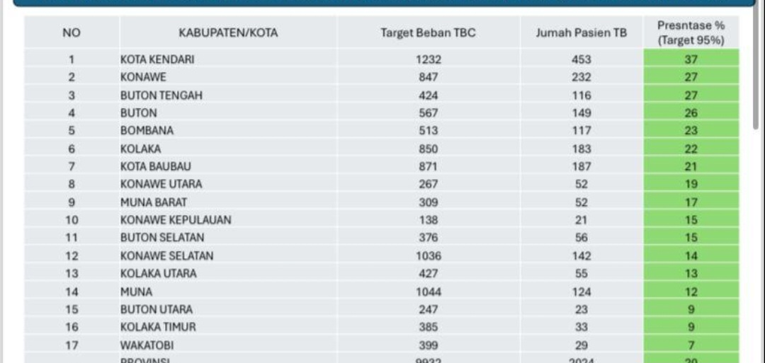 Untuk tingkat kesembuhan, Kabupaten Buton Tengah mencatat angka tertinggi sebesar 91%, sedangkan Konawe Utara terendah dengan 59%. Sementara itu, angka kematian tertinggi berada di Muna sebesar 10%, dan terendah di Buton Selatan dengan 2%. Total angka kematian akibat TBC di Sultra adalah 6%, sedikit di atas target nasional 5%.