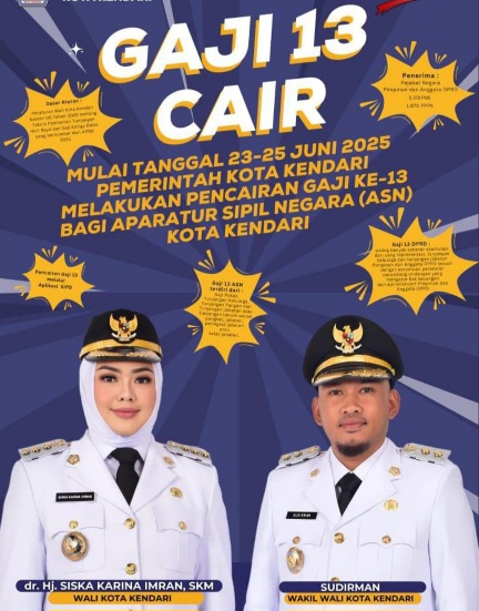 “Penerima Gaji ke-13 meliputi ASN, Pegawai Pemerintah dengan Perjanjian Kerja (PPPK), pejabat negara seperti Wali Kota dan Wakil Wali Kota, serta pimpinan dan anggota DPRD Kota Kendari. Komponen gaji yang diterima terdiri dari gaji pokok, tunjangan keluarga, tunjangan pangan, tunjangan jabatan, serta tunjangan lain yang bersifat melekat,” terang Maarfin pada Senin (23/6/2025).